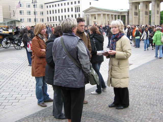 五月十三日星期四,柏林部份法轮功学员在柏林著名景点,地标建筑博兰登堡门(Brandenburger Tor)前的巴黎广场上向游客和市民讲述法轮功的美好和在中国无辜被迫害的真相,并庆祝法轮大法日。