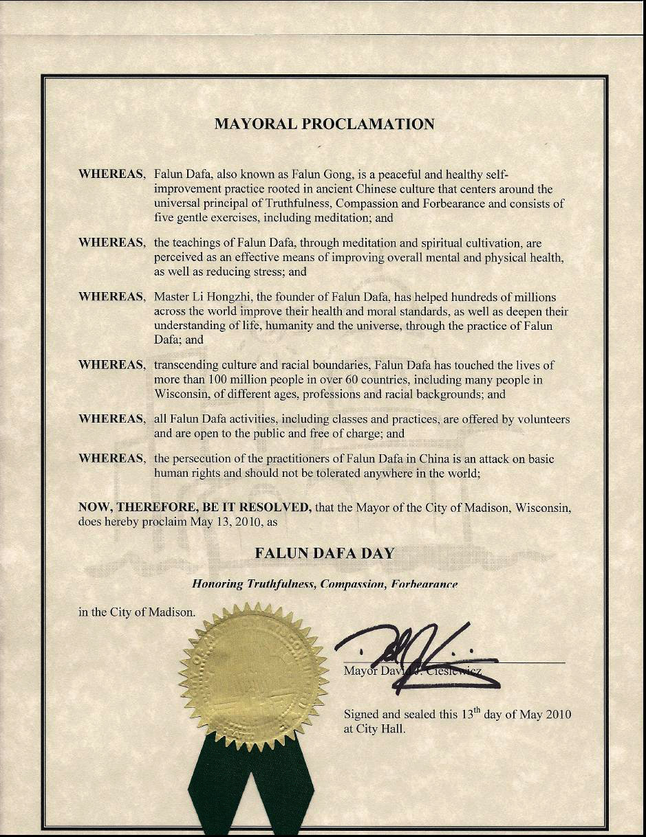 因此,我,威斯康星州麦迪逊市市长宣布二零一零年五月十三日为麦迪逊市“法轮大法日”,以表彰“真、善、忍”。