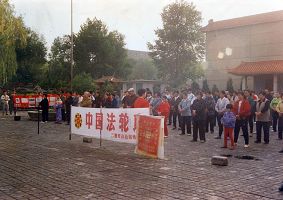 以第二张照片为例简要介绍一下1999年7.20以前中国大陆的法轮功炼功点。集体炼功时间由炼功点的学员商量而定,最早有3、4点钟开始的,一般都在早晨5、6点钟,晚上集体炼功的较少,因为晚上一般是集体读大法书籍的时间。从照片可以看出有一个带有法轮的旗、一个横幅和一个宣传栏(画面左边远处)。一般有一、两名动作标准的学员面向大家,主要是方便新学员记不准动作时参照,也便于观察到哪个学员动作不准,及时纠正。宣传栏是精心选材制作的,里面的内容丰富全面,有照片也有文字说明,主要方便世人了解大法。
