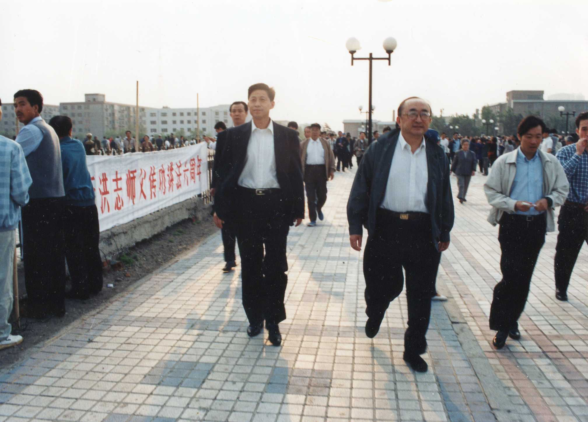 这些照片记录的是一九九八年四、五月间长春法轮功学员集体炼功的情况。其中有两张是当时的国家体委主任伍绍祖来长春调查法轮功情况,早晨到长春文化广场观看学员炼功的情景。
