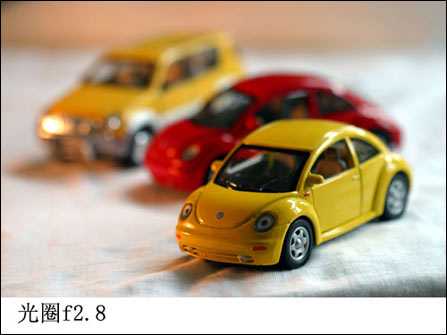 第一张F2.8,光圈大,F值小,景深很小,背后的景象被虚化: