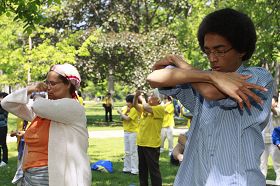 油画家魏莲丝(Susan Williams)和她的儿子参加集体炼功