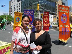 来自菲律宾的维奇(Vicky)和她的朋友在观看游行,她说:“我们支持法轮功,中国政府(指中共)对他们的迫害是不人道的,要制止这种迫害。”