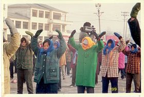 历史照片:九九年二月二十日在东门炼功点 |  历史照片:在集体炼功 |