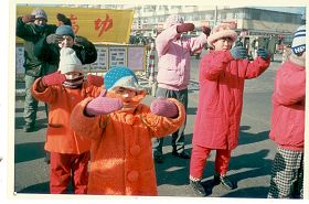 历史照片:九九年一月一日在东门广场集体炼功 |  历史照片:九九年一月一日在东门炼功点 |
