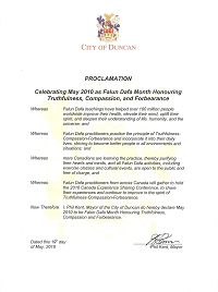 二零一零年五月十九日,加拿大不列颠哥伦比亚省邓肯市市长宣布五月为“法轮大法月 颂扬真、善、忍”。