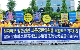 二零一零年五月二十八日,中共国务院总理温家宝访韩,韩国法轮大法学会在中共驻韩大使馆前举行新闻发布会,呼吁“立即停止在中国进行的对法轮功长达十一年的迫害,立即法办迫害法轮功的元凶江泽民及其帮凶。