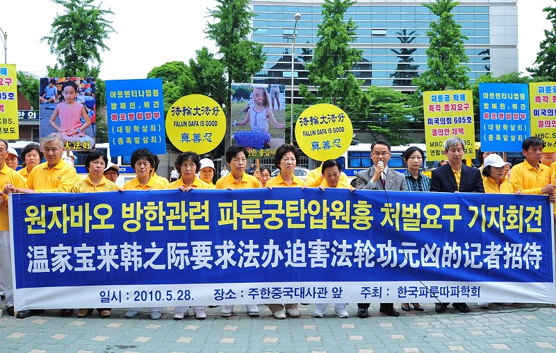 ![]() 五月二十八日,中共国务院总理温家宝访韩,韩国法轮大法学会在中共驻韩大使馆前举行新闻发布会 |
