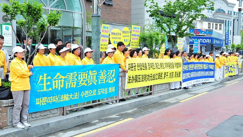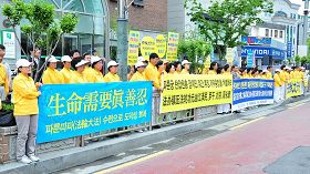 ![]() 法轮功学员在中共驻韩大使馆前,呼吁制止迫害、法办元凶 |