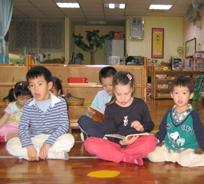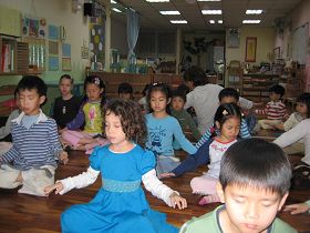 ![]() 善善(中间者)和其他小朋友一起读法轮功经书《洪吟》 |