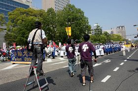 笔者注意到:虽然广岛的市民们早已熟知法轮大法的参与队伍,但当法轮大法的队伍经过时,他们仍象第一次看到一样,脸上泛着震撼、欣羡、敬佩的神情。
