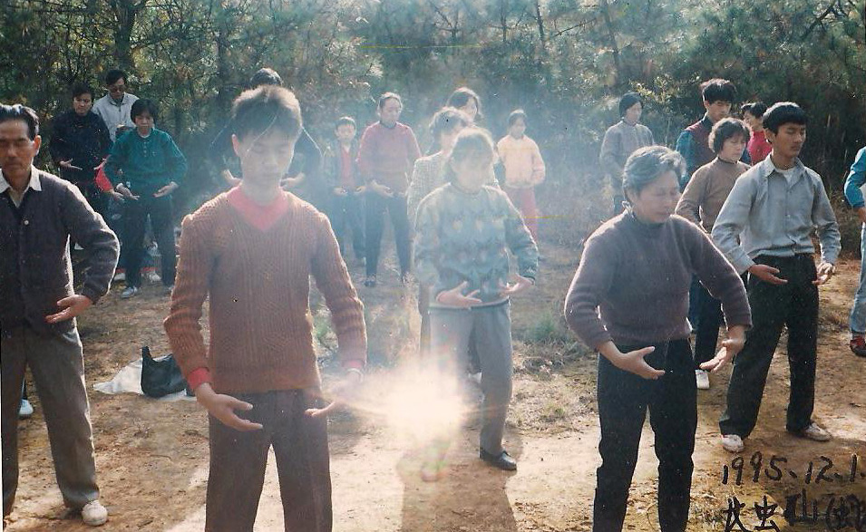 【明慧网二零一零年五月八日】一九九五年十二月一日,云南省交通学校与云南冶炼厂等炼功点的大法学员,借周末休息日,到昆明市西郊蛇山(又名长虫山)集体炼功洪法,当时拍了一组照片,这是其中之一。照片上可以清晰的看到水平方向旋转的法轮。