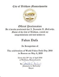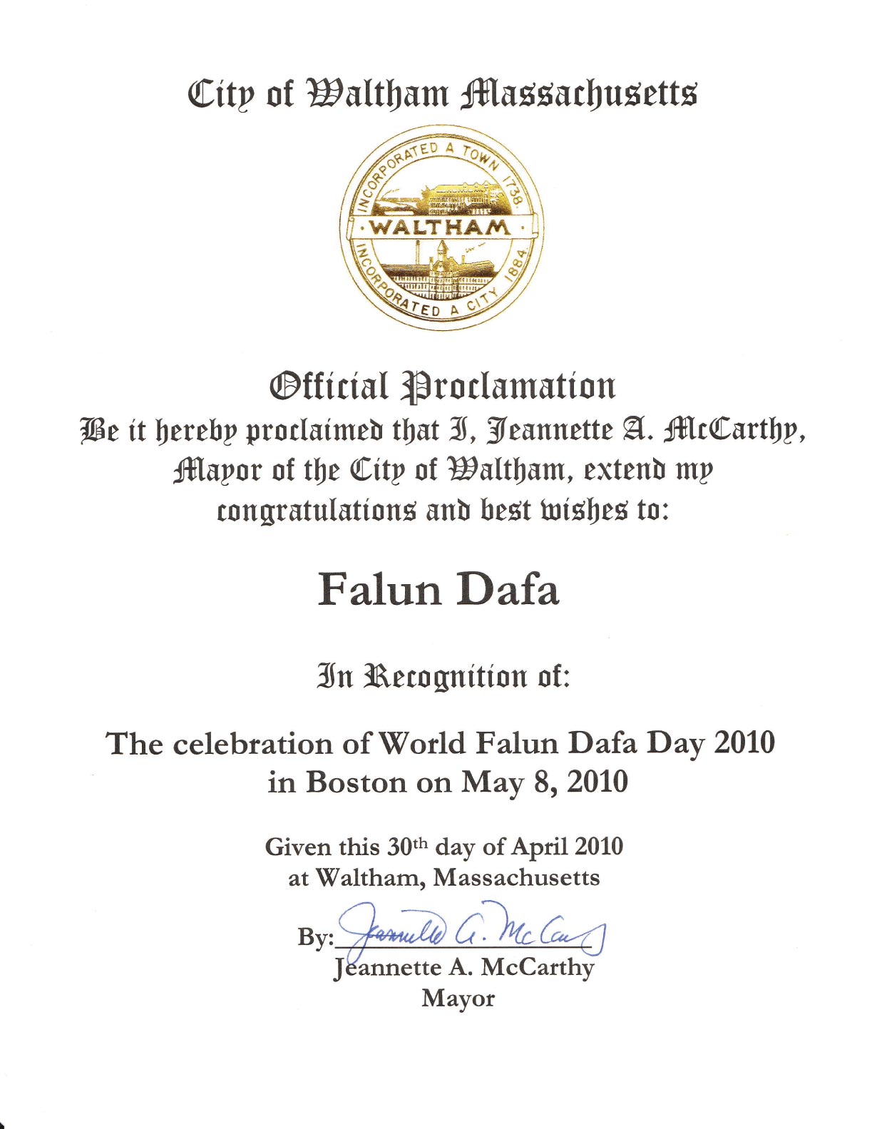 现在我,沃萨姆市市长,珍妮特·麦卡锡,特此向法轮大法修炼者表示赞扬和衷心的祝愿,祝愿五月八日在波士顿庆祝二零一零年世界法轮大法日的活动圆满成功。