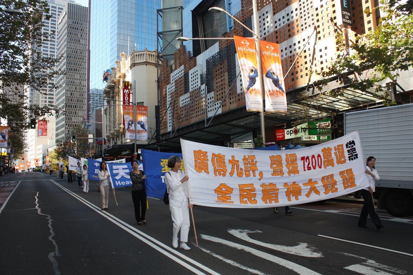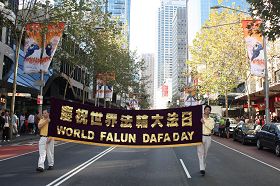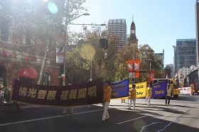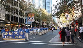 【明慧网二零一零年五月九日】(明慧记者华清澳洲报导)五月十三日是“世界法轮大法日”,是大法开传普天同庆的日子。二零一零年五月八日,百余名悉尼法轮功学员在法轮大法日前夕的周末,在市中心的市政厅广场集会,穿越主街举行了游行和庆典活动,庆祝法轮大法弘传十八周年,以此感颂师恩。