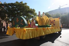 壮观的法轮大法天国乐团在游行队伍前打头阵,《法轮大法好》、《法正乾坤》等演奏曲响彻云霄,紧跟广传《九评共产党》、促“三退”(退党、退团、退队)方阵,将全球三退大潮生动,形象化地表现了出来;随后则是揭露中共迫害法轮功的真相,一辆平板大卡车上的真人酷刑展将中共活体摘取法轮功学员器官牟利、这个星球上有史以来最邪恶的暴行揭露出来,并配备双语同声解说;最后一个方阵是腰鼓队,他们打着欢快的鼓点,使得每一个人都是精神抖擞,神采奕奕。