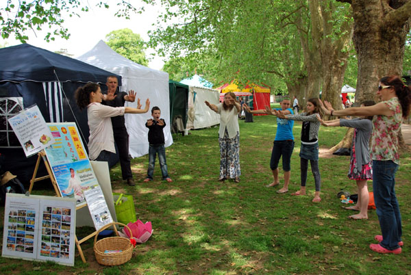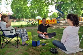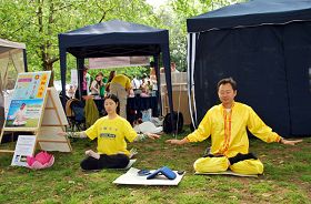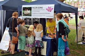 应许多游人的要求,学员们在第二天的活动日里安排了义务教功活动,时间还没到,就有人早早在一旁等候,许多孩子也和大人一起饶有兴趣地学习功法。第二个活动日的整个下午,学员一直在为一批批前来学习功法的人义务教功,学完后,人们的心情非常喜悦,热情地和学员攀谈,不舍离去。当地的中国留学生经过法轮功的展位时,有的拿着相机拍照,有的近前仔细观看揭露中共迫害法轮功的展板。