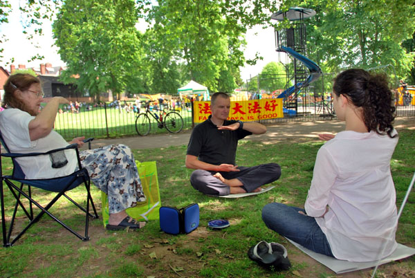 在展台的后方,学员在悠扬祥和的音乐中展示法轮功的五套功法,吸引着许多游人驻足观看,久久不愿离开。第一天活动即将结束时,当地一名报社的记者来到展位前找到学员要拍几张炼功的照片,刊登在当地的报纸上,他对法轮功的功法非常喜爱,赞不绝口。许多游人也纷纷前来询问在埃克塞特有没有地方可以学习法轮功。