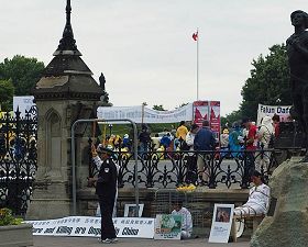 十六日中午,曾经在中国被迫害的法轮功学员和家属在国会山内举行的新闻发布会上讲述了他们的经历。来自加东城市的法轮功学员风雨中在国会山草坪上炼功,一些学员采取征签、模拟酷刑展等方式向过往的游客讲真相。
