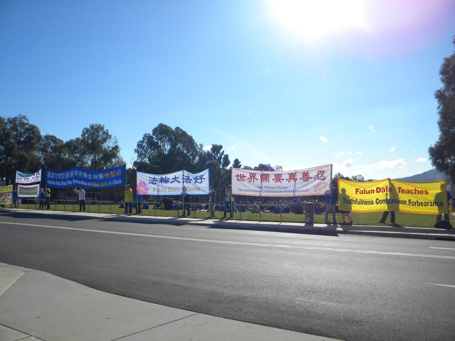 二十日下午,法轮功学员得知中共代表团可能在下午五点到达堪培拉机场。二点左右,他们就在几个主要路口拉好横幅静静等待,堪培拉警察在核实法轮功学员的身份与诉求后欣然应允他们表达诉求的权利。习近平的专机于三点四十五分提早到达机场,不知他们是否是为了避免正面遭遇法轮功学员的抗议而选择了从机场后门出来,但仍然无可回避地遇到在后门等待已久的法轮功学员的抗议。在其前往凯悦酒店的路上,法轮功学员也沿途陆续打出“法轮大法好”“天灭中共”等条幅,让这个代表团的每个成员感受到民主国家的不同。