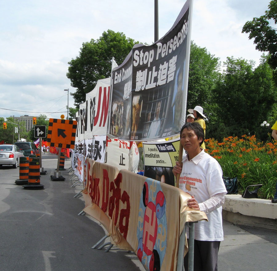 【明慧网二零一零年六月二十六日】(明慧记者章韵渥太华报道)二零一零年六月二十三日、二十四日,中共党魁胡锦涛一行在加拿大首都渥太华访问期间,在胡入住的威斯汀旅馆、要开会的总督府和要与加拿大总理会晤的国会山庄,法轮功学员都打出横幅,呼吁“停止迫害法轮功”、“法办江罗刘周”。胡一行所到之处都能看到法轮功学员打出的横幅和听到反迫害的呼唤声。法轮功学员的所作所为也令很多世人明白他们慈悲救人之心。