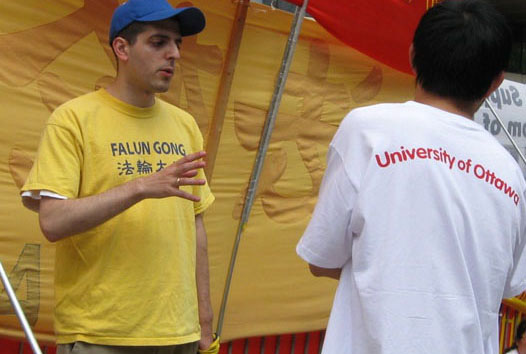 她介绍说,一位渥太华大学的半工读生,听完了法轮功真相和退党保平安的好处后,他说明白了真相后感觉很舒服,同意用“谢平”两字做了三退。他还说:“我现在才知道你们是真正地在救人。”并要求要与周女士合影留念,还表示回去后要读《转法轮》