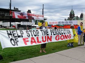 【明慧网二零一零年六月二十七日】(明慧记者英梓、苏珊渥太华报道)胡锦涛于二零一零年六月二十三日下午到达渥太华,对加拿大进行两天的访问。中使馆为了不让胡锦涛一行看到法轮功学员的抗议,回避人权问题,做了很多安排,包括,用花钱雇来的学生遮挡法轮功学员的横幅;抢占法轮功学员抗议地点;在酒店正门前建木制隔板,遮挡酒店落地窗;在法轮功抗议地点拍照骚扰;取消媒体发布会等等。