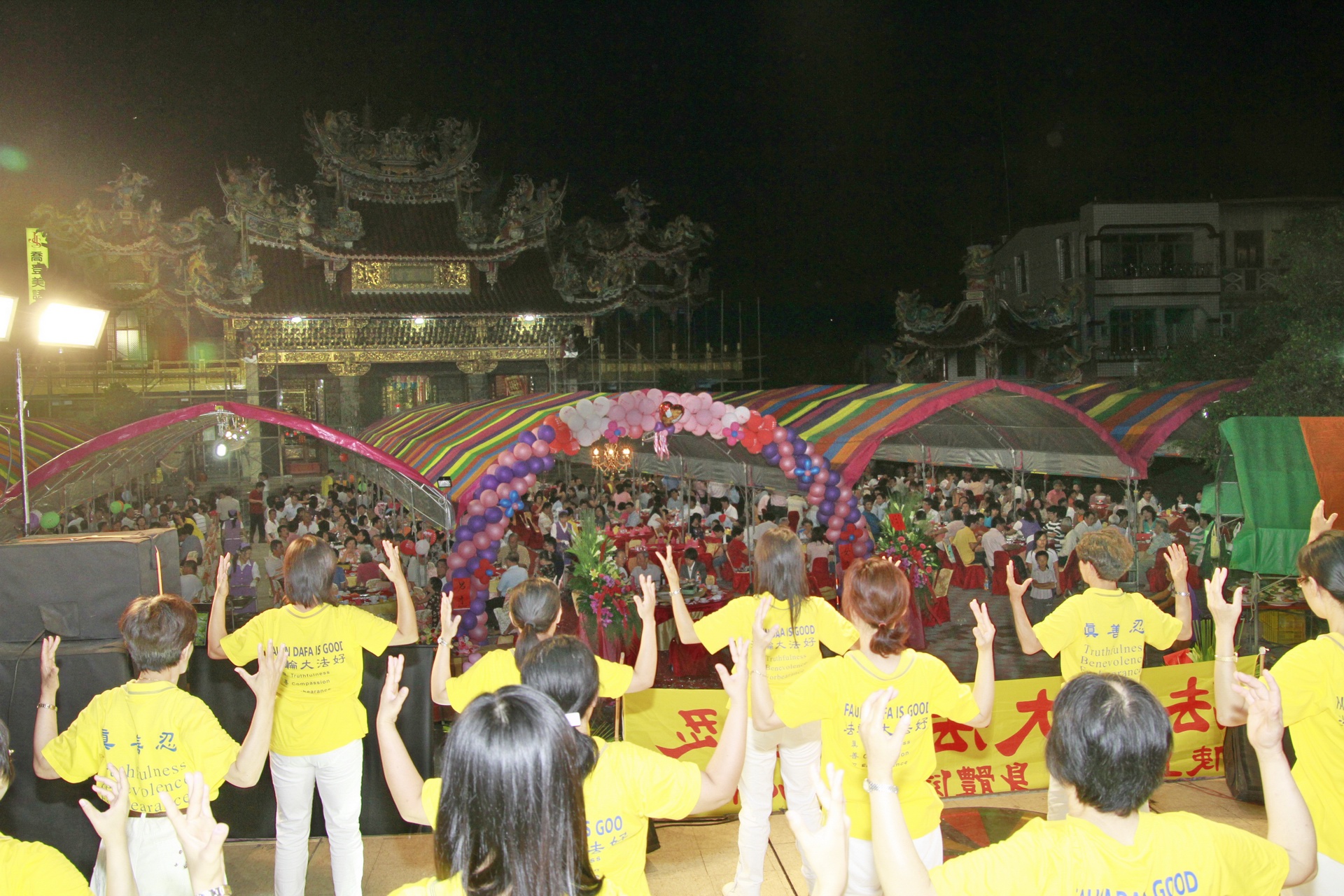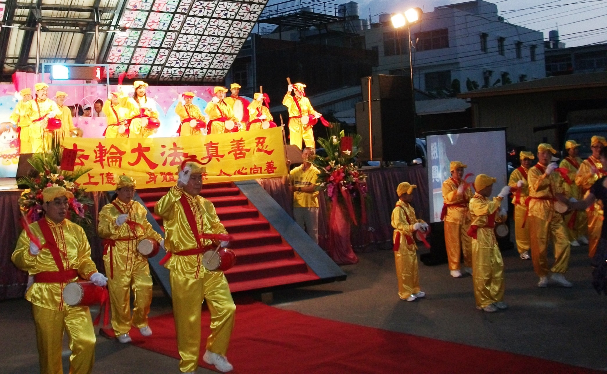 ![]() 喜宴上以法轮功学员组成的腰鼓队表演为之开场 |