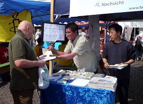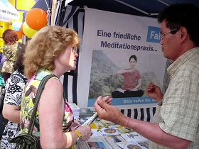 【明慧网二零一零年六月三十日】位于德国南部的卡尔斯鲁尔每年六月都有一次民众节,城里的各个团体、协会都会在节日的集会上亮出自己的展位。二零一零年六月二十六日,法轮功学员再度于民众节上为德国民众讲述法轮功的真实情况。人们明白真相后纷纷声援法轮功,签名制止中共的迫害。