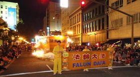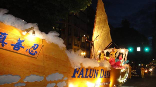 今年是波特兰市第一百零五届玫瑰节星光遊行。在连续几天的阴雨中,六月五日一大早,明媚的阳光突然普照整个城市。夜幕刚落,由一百多支队伍组成的遊行开始了,在众多的花车中,宁静的“法船”,悠扬的音乐,白云上轻柔的法轮功功法展示,彩莲上仙子们灿烂的笑容,使两旁路人的喧闹声戛然而止,他们目光注视着法船,连声说着:“Falun Dafa(法轮大法)!太美了!太美了!”好象看到了新的希望,很多人露出惊叹和幸福的表情。
