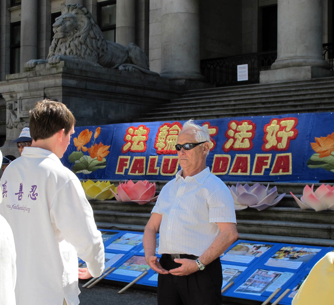 当法轮功学员刚刚开始炼功时,一位中年白人男子对着法轮功学员,单腿跪在炼功场的一角约十分钟。待他站起之后,经过交谈,知道他名叫安吉(Angel),温哥华市民,他说:“我看到这个场非常好,非常纯净,发出强烈的光亮。”还说:“我知道这些人都是从上面来的,”他指指天上,“知道你们为什么受迫害,也知道你们今天为什么来到这里,你们最后都要回到天上去的。”他说,他看到满天都是神、天使,还指着天上的一块白云说,上面有一个大神等等。