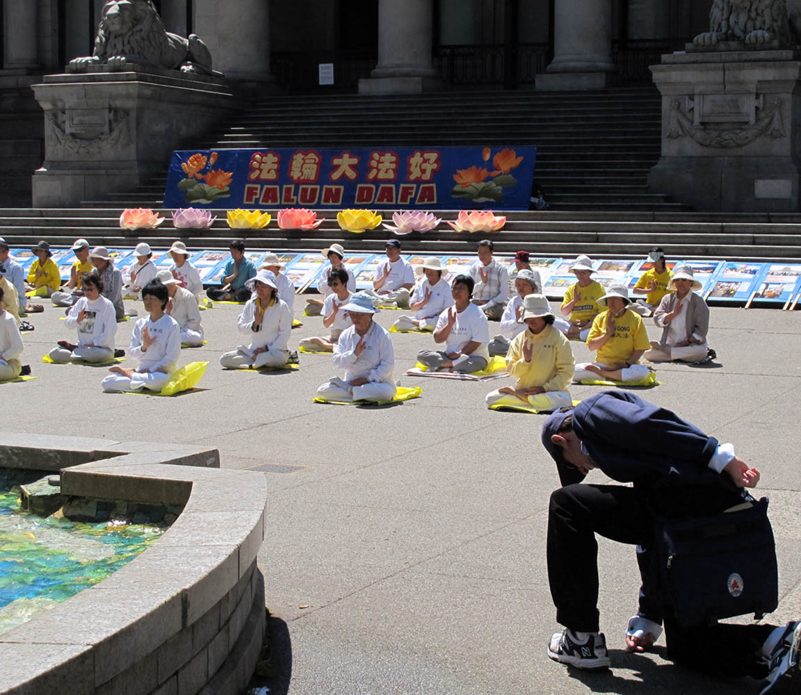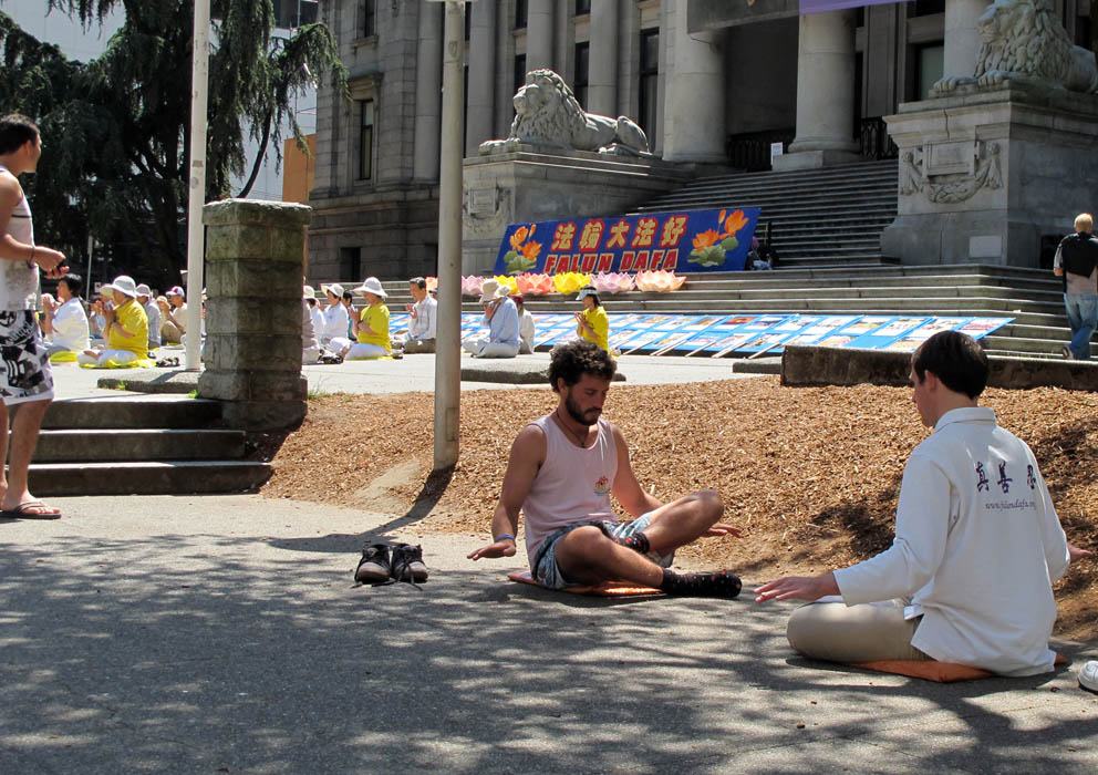 【明慧网二零一零年七月十八日】(明慧记者王枚温哥华报导)二零一零年七月十七日,中共迫害法轮功达十一年之际,加拿大温哥华法轮功学员在市中心艺术馆后广场举行大型炼功,同时还以图片展、讲真相等活动揭露中共的暴行。祥和的炼功场面吸引许多民众注目观看,人们通过和法轮功学员交谈,了解了真相,并有多人当场学功。