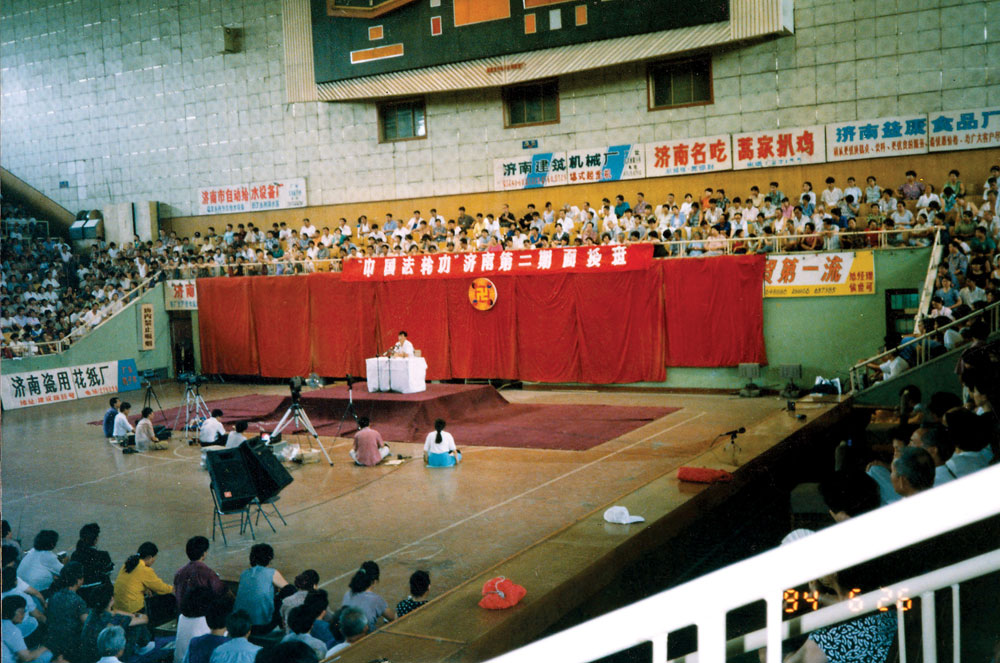 ![]() 1994年6月,李洪志师父在中国法轮功济南第二期传授班上讲法传功。整个体育馆座无虚席,有4000多人参加。(中国,济南体育馆) |