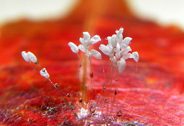 飘落的枫叶上盛开圣洁的花,纤细的花瓣,花朵褶皱和花蕊清晰可辨(辽宁省,2009年)