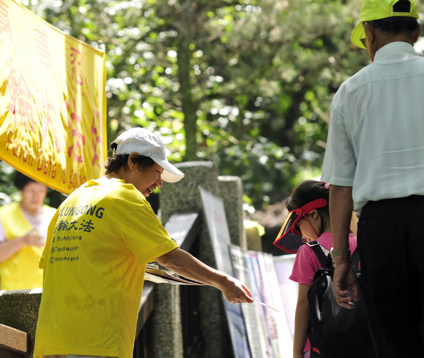 一九九九年七月二十日,中共开始全面对法轮功的迫害,至今已持续十一年。法轮功学员为制止这场迫害,利用各种机会讲述真相,大陆游客来台观光的景点,就成了法轮功学员常驻的地方。经常在日月潭的玄光寺给大陆游客讲真相的学员彭女士提到,学员在日月潭给大陆游客传递法轮功真相资料、表演功法,经年累月地无私付出。有些更是上了年纪的学员,可是个个精神抖擞,慈祥和蔼、坚持不懈的态度,让人感动不已。