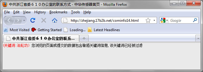 上面的网络截图是从海外访问中国国内中华传感器黄页中有关浙江省610办公室联系方式的网页,结果被中共的网络封锁过滤,因为其中有所谓的“关键词”:法轮功。中共连浙江省610办公室的联系方式也不让海外知道,可见其心虚的程度,因为中共一直不敢对外界公开承认610办公室的存在。