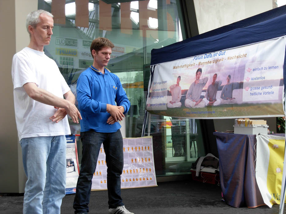 “这是怎么回事?”一些路人询问在发送资料的法轮功学员。“他们正在炼的是法轮功。法轮功是一种中国传统的功法,教人以真善忍做好人,给人带来身心健康。自从九二年法轮功在中国传出后,很多人因此受益,法轮功也传遍世界上百个国家。”一位法轮功学员指着炼功的学员介绍道,“但是十一年前,中共开始了对法轮功的迫害,因为他们不允许人们按照真善忍做个好人。如果在中国有人象他们一样炼功,就会被关押到监狱中去,遭到酷刑折磨。这些照片展示的只是一小部份学员遭迫害后的情况。”