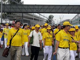 七点三十分,随着一声号令,兴奋的人群开始向出发闸门涌动,几乎清一白色的人海,带着轻微的吆喝声开始了今年的五公里大竞走。和以往的大竞走相比,今年的显得平淡和平静,没有了前面几届多姿多彩的服装、各式各样旗牌、横幅等,然而,由三四十人组成的鲜黄色的队伍,吸引了公众的视线。人们纷纷举起手机、相机对着这群黄衣黄帽的队伍拍个不停,有的还轻声地呼出“法轮功”三个字,并直接和队伍中的法轮功学员交谈。