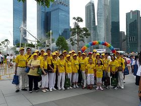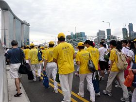 一位住在新加坡、原籍中国的六十岁男子和他全家边走边好奇地和学员聊着:法轮功可以这样公开地走啊?学员解释说:法轮功在新加坡是合法注册的,其实不但在新加坡,在世界一百多个国家都是合法的。那位男子又说:这在中国就不行。学员回答说:中共在迫害法轮功。然后给他讲了法轮功是能祛病健身,是教人做好人的佛家上乘修炼功法。那男子说,难怪看你们个个的气色都很健康。