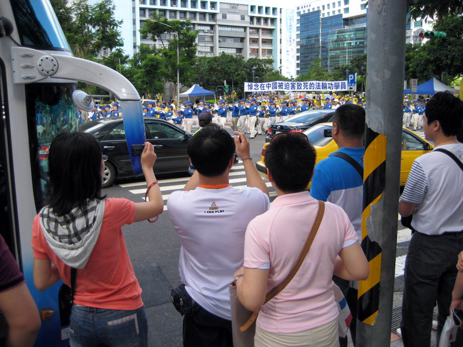 下午三点半至六点的时间,法轮功游行队伍行经大台北最热闹的东区信义广场,全程约五点三公里。威震四方、雄劲壮阔的天国乐团为前导队伍,庄严祥和缓缓行进时,吸引大批的中国大陆游客及台北市民驻足,人们纷纷拿出手机抢拍难得的画面,在天桥、街道上市民目不转睛,盯着游行队伍直到消失在街角的尽头,有的民众接到真相传单马上阅读起来。