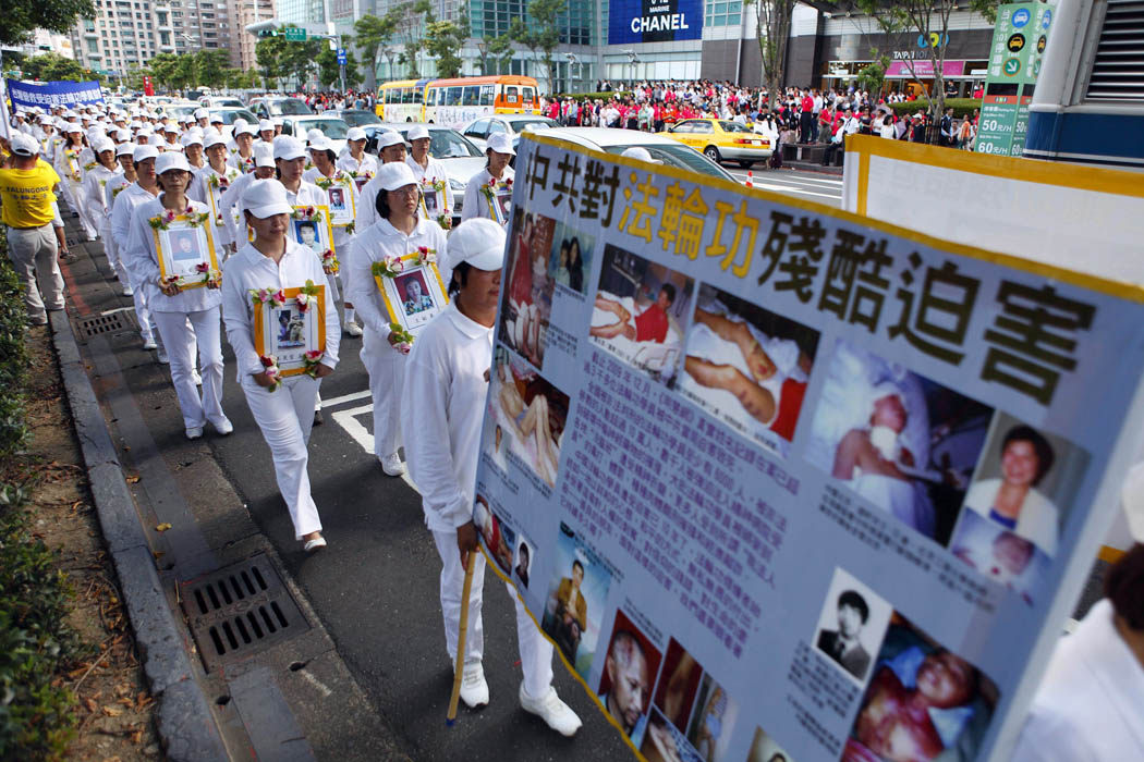 “呼唤良知 停止迫害”游行队伍在一零一广场展开,吸引了大批的大陆游客驻足观看高精度图片