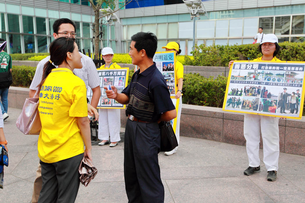 有一位观光客主动向学员多拿一些真相资料,并表示想拿回去分送给亲友,这位游客表示从小就移民到越南,今天刚好带着越南的朋友,在逛一零一大楼时,看到法轮功学员举办的活动。他说:“场面太震撼人心,令我感动到想掉眼泪。看到法轮功学员个个慈眉善目,非常的祥和,根本不象中共宣传那样。我是非常支持有信仰,尤其是修佛的人,法轮功根本就不参与政治。”