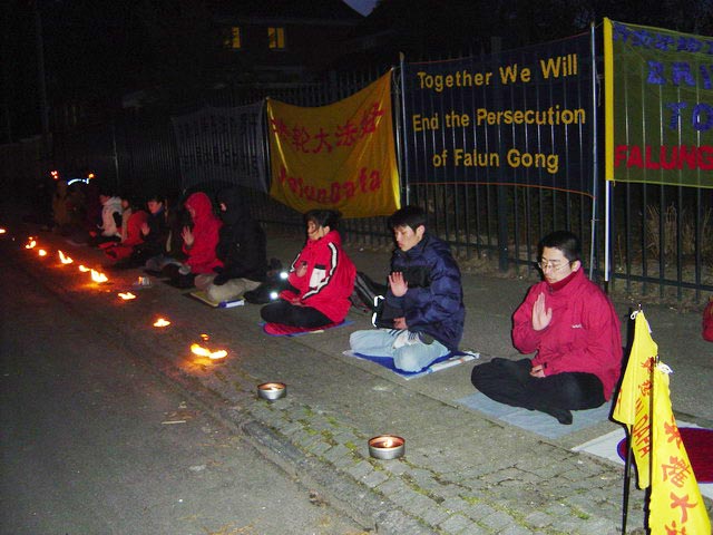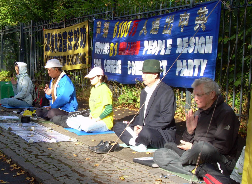 就这样,朱先生和另一位西人学员、退休航空机械师鲍尔(Poul)开始了每天一个小时到中共大使馆前的定期抗议活动。这成为了当地学员的一项主要活动,大家都利用自己的空闲时间,不定期地参加进来。大家的共同决心是:迫害法轮功一天不停止,我们就在这里抗议一天。