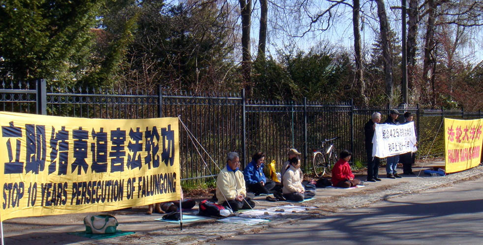 自从九九年七月二十日中共发动了全面迫害法轮功以来,丹麦法轮功学员们从开始不定期地去中使馆抗议迫害,后来成为每天一小时的定期活动。参加的法轮功学员人数不定,有时一、俩人,有时数十人,无论晴天下雨,寒来暑往,从二零零二年四月到现在时间已经走过了八个年头,风雨无阻坚持了超过三千日。