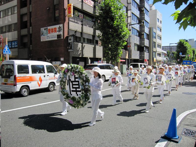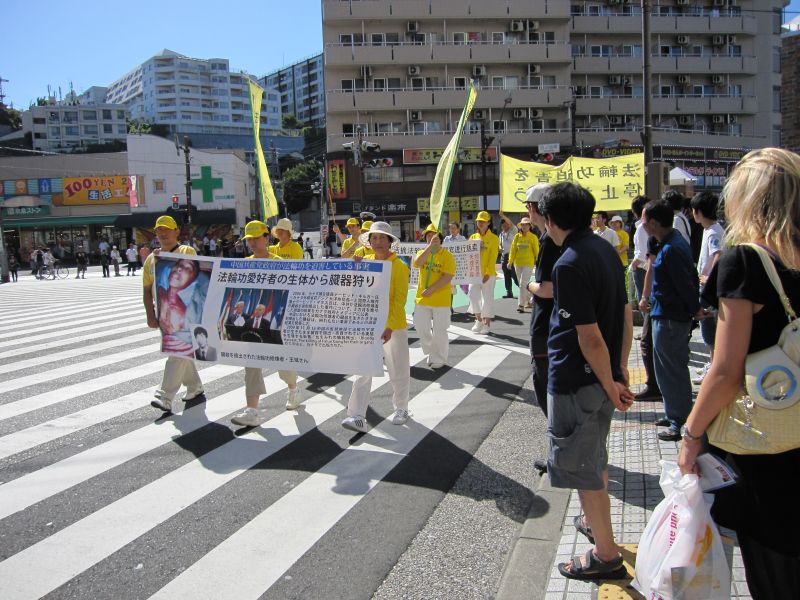 下午两点半反迫害游行队伍从大通公园出发,途经横滨市政厅,繁华的商业街,历时两小时。游行以天国乐团为先导,随后是身穿白衣、手捧被迫害致死的法轮功学员遗像的女学员队伍。游行队伍打出“法轮大法好”、“停止迫害法轮功”等中日文横幅,还有法轮功学员遭受酷刑折磨的图片展板,道路两边有学员不断给行人派发有关介绍法轮功和揭露中共迫害的资料。