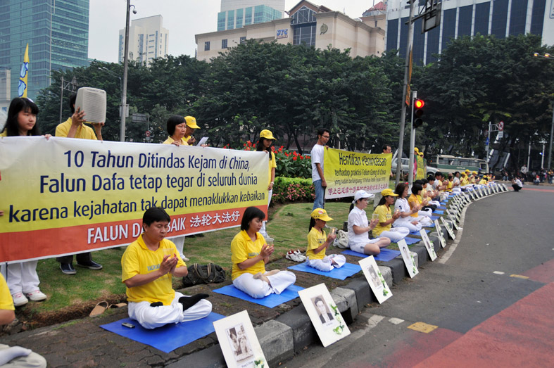 【明慧网二零一零年七月二十日】二零一零年七月十七日下午三点整,印尼雅加达的法轮功学员在邦达让.巴东.奥博(Bundaran Patung Obor)举行活动,和平抗议中共对法轮功长达十一年的残酷迫害