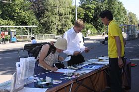 当电车靠近布鲁瑙街这一站时,很多乘客惊讶地看到街边的墙上挂出了多幅横幅,有的印着静坐的照片,有的印着中文“真善忍”三个大字,也有的是法轮功学员在遭到中共酷刑折磨后满是伤痕的照片,并写有“中共活摘法轮功学员器官,请帮助制止对法轮功学员的群体灭绝”。有的乘客则被法轮功学员随着优美的音乐展示的功法所吸引。他们纷纷接过真相报纸,希望能了解更多的讯息。