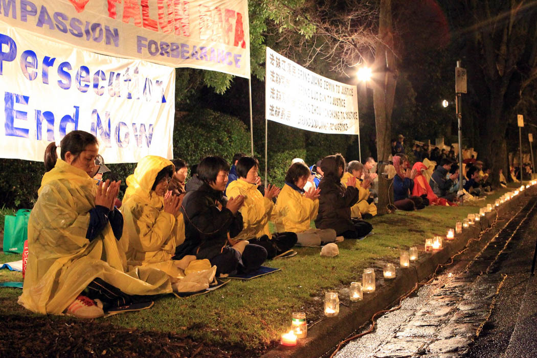 暗夜寒雨下,点点烛光摇曳不灭。中领馆前,墨尔本法轮功学员们自始至终在草坪上静坐,坚毅而平和的身影在风雨中没有丝毫动摇。没多久,风雨渐歇,他们依旧面带祥和静静打坐。面对中领馆,他们打出的中英文横幅有「法轮大法」、「十一年迫害必须结束」和「法办江泽民、法办罗干、法办周永康、法办刘京」。整个场面凝重坚忍而又平和感人。