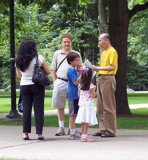 二零一零年七月十八日,学员们再次聚集在安娜堡校园中心的草坪上,宁静安详地炼习五套功法,一面面真相横幅、展板让很多师生驻足观看,了解了什么是法轮功,为什么正在遭受无端的迫害,等等。发放传单的学员们和行人交谈,也有人停下来学炼功法。