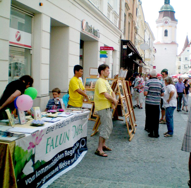 奥地利法轮功学员为了制止中共对法轮功长达十一年的迫害,在七二零前开始了全国巡回讲真相活动,呼吁共同制止中共暴行。七月十七日,法轮功学员的活动来到了小镇克瑞姆斯。