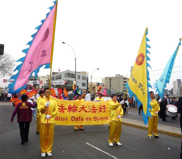 法轮功游行队伍是这届活动中,吸引观看民众的一大亮点,队伍中打头阵是三位举着有法轮标志彩旗的男士,接着六位男士举着写着“法轮大法好”“法轮大法在秘鲁”“真善忍”中西文三幅横幅,着装金黄中式炼功服,紧跟着的是十二位着古装手持扇子的女士们,随着优美动听的古曲翩翩起舞着。